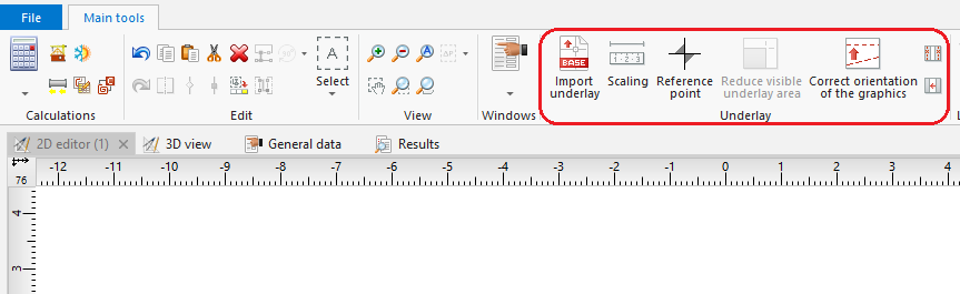 - Ikony elementów i funkcji dotyczące importu podkładów dostępne są w oknie Edytor 2D na pasku Narzędzia główne w sekcji Podkład przy włączonym zakresie edycji Podkład.