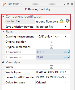 - Plik podkładu może być przechowany w pliku projektu *.ISPROJ, tym samym zwiększając jego objętość (identyczne pliki podkładów rozmieszczone na różnych arkuszach roboczych nie powodują zwiększenia objętości pliku projektu wynikającego z jego wielokrotnego użycia) lub może być pozostawiony jako plik zewnętrzny (oryginalny), do którego będzie się odwoływał projekt. Ta druga opcja wymaga, w razie przekazywania projektu innej osobie, przekazania również plików z podkładami, a następnie aktualizacji ścieżek dostępu do plików na docelowym komputerze. Opcje lokalizacji zapisu podkładu oraz miejsce jego przechowywania można zweryfikować w tabeli danych w sekcji Identyfikacja elementu.