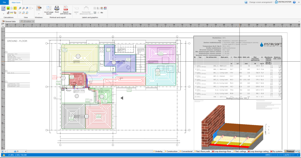 | Wyniki obliczeń | Kompletny zakres wyników obliczeń, xls Kompletny zakres dostępnych wydruków, pdf Wyniki obliczeń dla ogrzewania płaszczyznowego, pdf Zestawienie materiałów, pdf Parametry montażu, pdf |