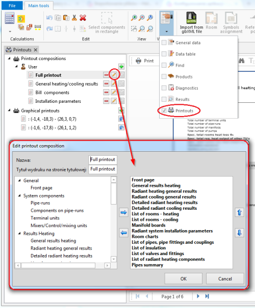 Predefiniowane kompozycje wydruków dostępne są w drzewie po lewej stronie okna Wydruki. Ilość i rodzaj gotowych propozycji zależy od używanej wersji programu. Możliwy jest wybór danej kompozycji i zapoznanie się z jej zawartością. Istnieje też możliwość utworzenia i zapisania własnych kompozycji wydruków, które będą później dostępne, obok kompozycji predefiniowanych, również dla innych projektów.