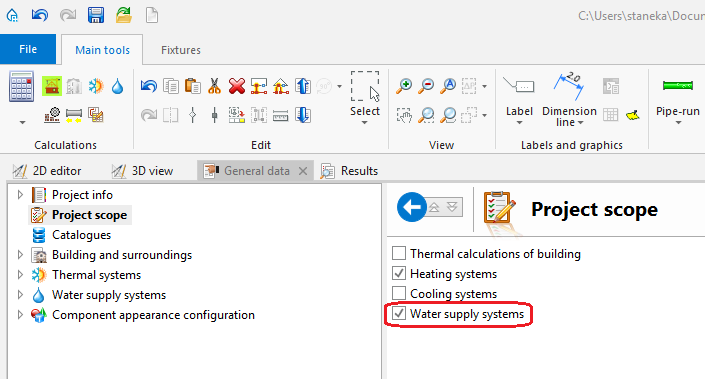 - Zakładka Zakres projektu - zaznaczyć zakres Instalacje wodociągowe.