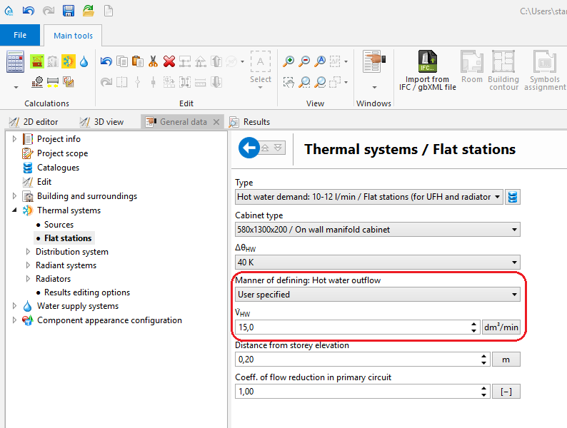 - Sposób deklarowania wartości: Wydatek c.w.u.: "Narzucone" lub "Na podstawie obliczeń modułu: Instalacje wodociągowe"