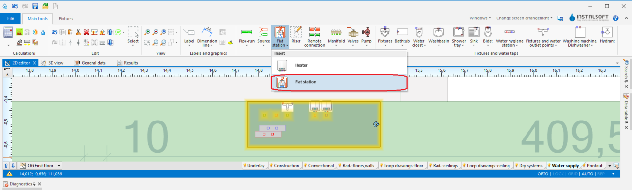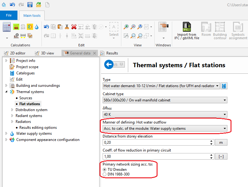 - Instalacje wodociągowe - jeśli w obliczeniach stacji i sieci zasilającej ma być uwzględniony przepływ z zaprojektowanej i rozrysowanej w InstalSystem 5 instalacji wodociągowej