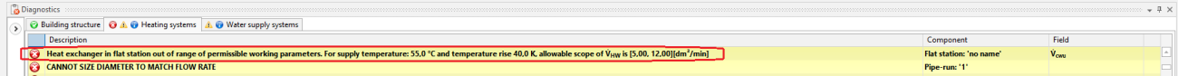 Typ stacji i wielkość wymiennika ciepła wybierany jest przez użytkownika, a program diagnozuje, czy dla podłączonej do stacji mieszkaniowej instalacji c.o. oraz zadanych/obliczonych parametrów c.w.u., wybrana stacja mieszkaniowa jest w stanie dostarczyć wystarczającą moc.