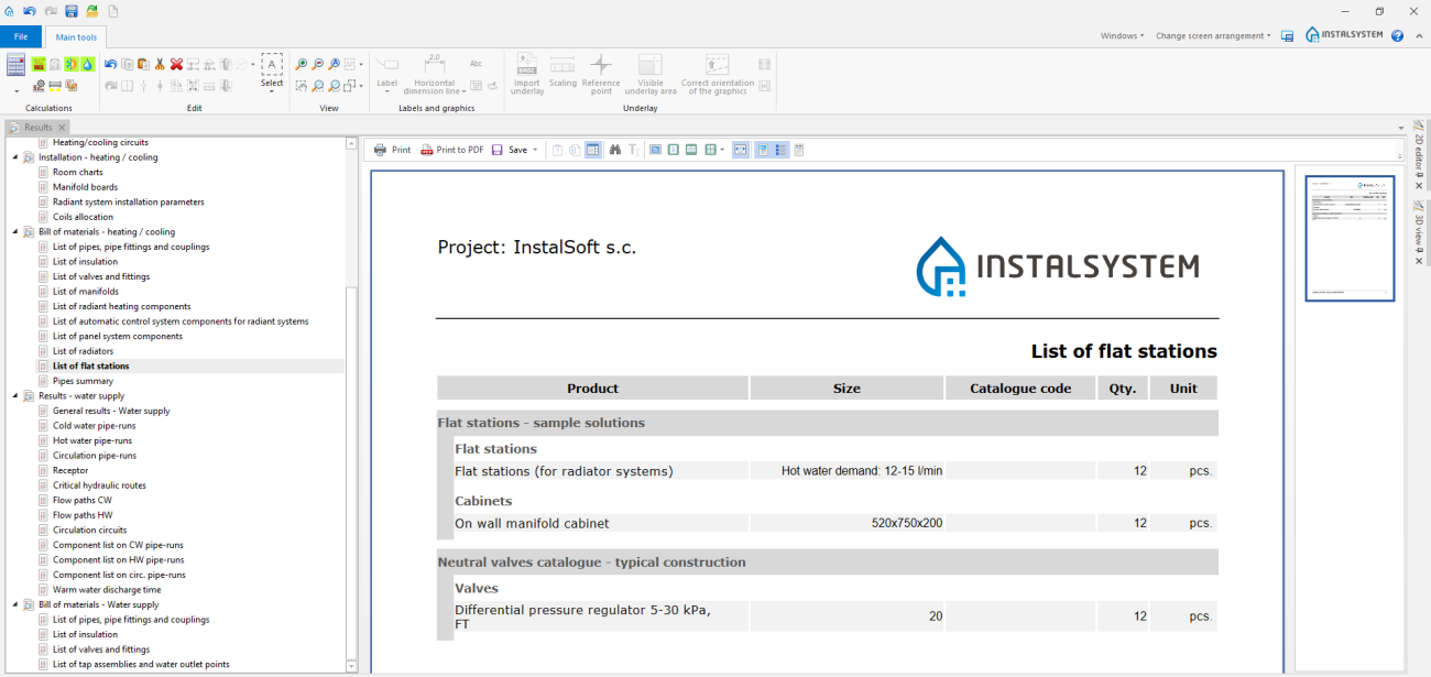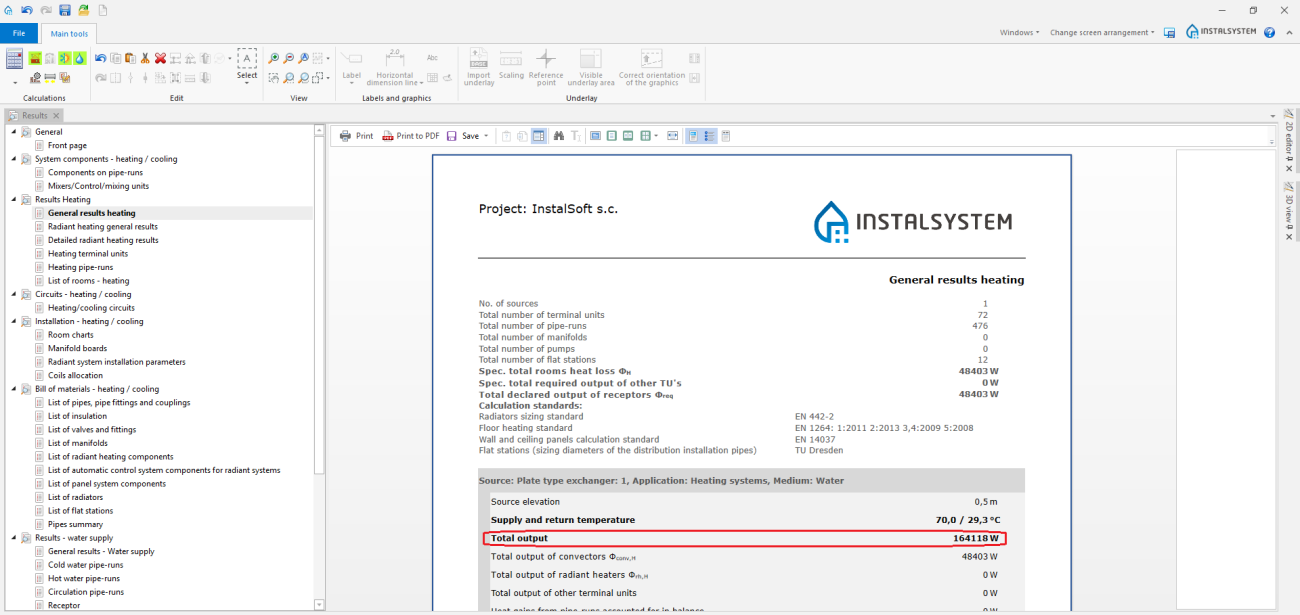 | Wyniki obliczeń | Kompletne wyniki obliczeń, xls Kompletne wydruki, pdf Wyniki obliczeń instalacji ogrzewania, pdf Wyniki obliczeń instalacji wodociągowej, pdf Zestawienie materiałów, pdf |