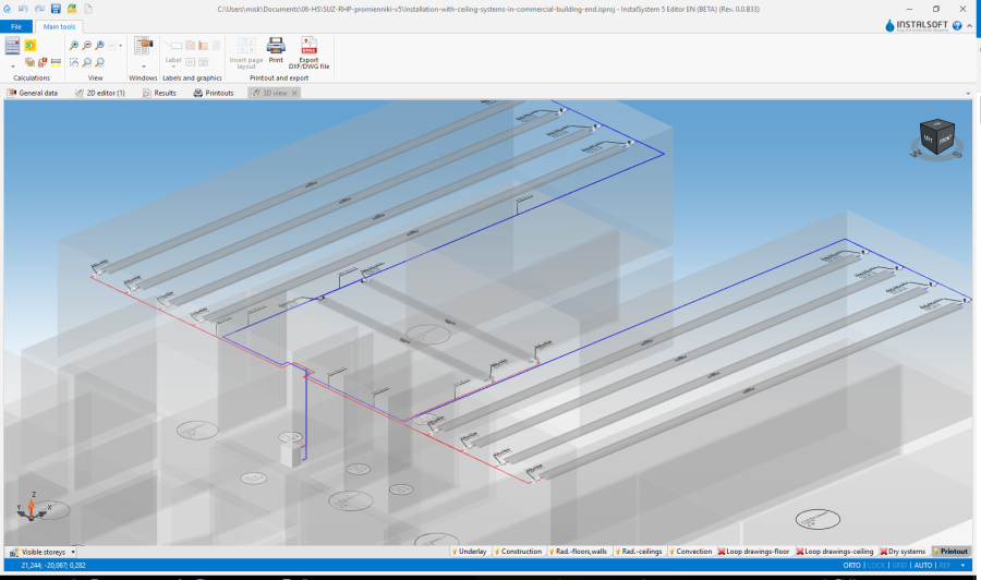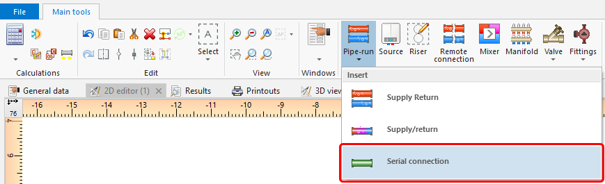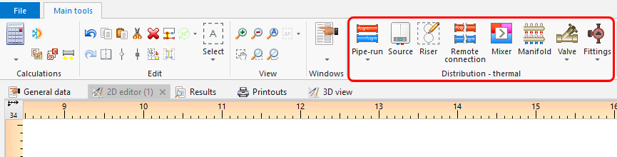 - Elementy rozprowadzenia czynnika w instalacji dostępne są w programie w sekcji Rozprowadzenie - instalacje cieplne na pasku Narzędzia główne, dla aktywnych zakresów edycji: Podł./Ścienne, Sufitowe lub Konwekcyjne,