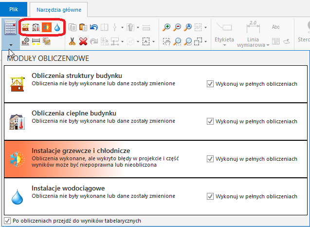 Na pasku narzędzi w sekcji obliczenia, oprócz obliczeń poszczególnych modułów dostępne są ikony: