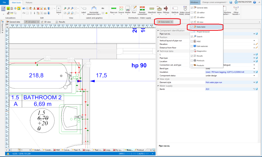 Każdy element w projekcie posiada swój zestaw danych, których edycja jest możliwa po zaznaczeniu tego elementu, przy pomocy Tabela danych. Dotyczy to zarówno elementów z zakresu konstrukcji budynku, elementów wszystkich projektowanych instalacji, jak również innych elementów, stanowiących obiekty programu - np. wspomniany przy imporcie rzutów kondygnacji obiekt "Plik graficzny" lub obiekt "Układ wydruku". Tabela danych można ją włączyć/wyłączyć poprzez jej wybór z menu Okna dostępnego na wstążce lub za pomocą klawisza F12.
