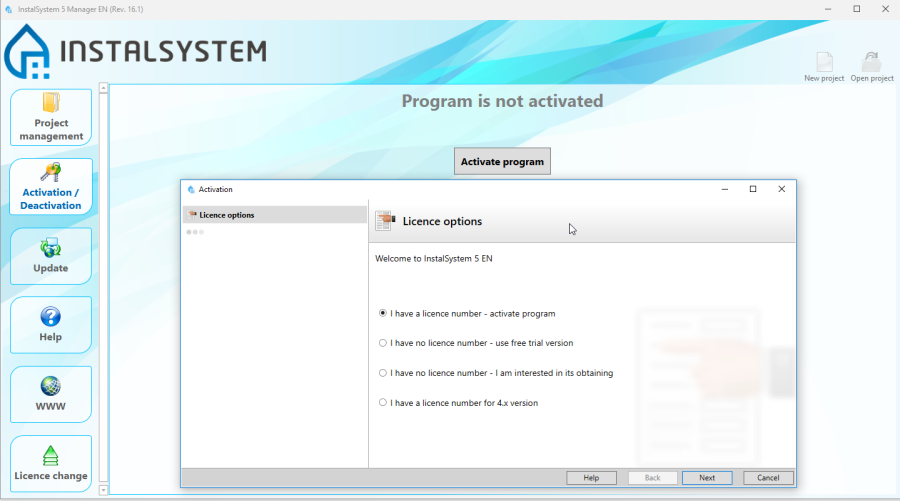 Pakiet wymaga instalacji na komputerze użytkownika oraz aktywacji. Do aktywacji licencji standardowych niezbędne jest posiadanie numeru licencji. Aktywacja wersji demonstacyjnej jest wykonywana bez numeru licencji. Aktualnie dostępne wersje demonstracyjne pakietu InstalSystem 5 są dostępne na naszej stronie internetowej: Wersje demonstracyjne.
