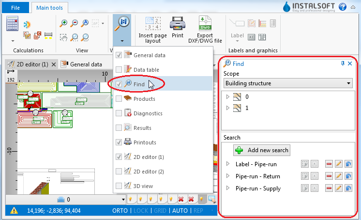 Narzędzie pozwala na wyszukiwanie w projekcie elementu lub grupy elementów. Wynikiem wyszukiwania jest zaznaczenie określonych elementów we wszystkich aktywnych oknach, takich jak: Edytor 2D, Widok 3D, Tabela danych, Wyniki i inne.