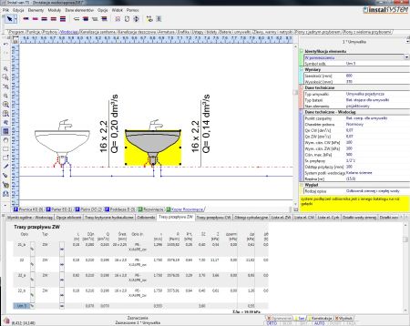 Narzędziem wspomagającym projektowanie instalacji z użyciem wymienionych w tym artykule rozwiązań jest program Instal-san (od wersji 4.13) w konfiguracjach z modułem T, autorstwa InstalSoft. Program umożliwia wykonanie pierścienia na rozprowadzeniu wody ciepłej i zimnej w obrębie podejść od pionów do odbiorników. Wykonanie schematu instalacji z podłączeniami trójnikowymi możliwe jest zarówno na rzutach jak i rozwinięciach. Dodatkowo dzięki nowej funkcji automatycznego podłączania odbiorników w systemie trójnikowym poprawne narysowanie połączeń stało się bardzo proste. Obliczenia instalacji pierścieniowej wykonywane są w oparciu o metodę Cross’a (3). W ramach obliczeń iteracyjnych pierścienia wyznaczany jest tzw. odbiornik rozcinający znajdujący się najbliżej punktu w którym strata ciśnienia przy przepływie z lewej i prawej strony pierścienia jest taka sama. Program wyznacza przepływy w obydwu gałęziach pierścienia oraz średnice podejść zgodnie z normą DIN 1988-300 (4), w oparciu m.in. o wymagane wypływy i ciśnienia w przyborach. Wyniki prezentowane są na rysunkach oraz w tabelach z trasami hydraulicznymi (Rys.7).