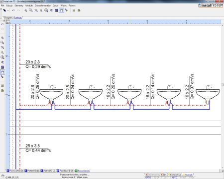 Narzędziem wspomagającym projektowanie instalacji z użyciem wymienionych w tym artykule rozwiązań jest program Instal-san (od wersji 4.13) w konfiguracjach z modułem T, autorstwa InstalSoft. Program umożliwia wykonanie pierścienia na rozprowadzeniu wody ciepłej i zimnej w obrębie podejść od pionów do odbiorników. Wykonanie schematu instalacji z podłączeniami trójnikowymi możliwe jest zarówno na rzutach jak i rozwinięciach. Dodatkowo dzięki nowej funkcji automatycznego podłączania odbiorników w systemie trójnikowym poprawne narysowanie połączeń stało się bardzo proste. Obliczenia instalacji pierścieniowej wykonywane są w oparciu o metodę Cross’a (3). W ramach obliczeń iteracyjnych pierścienia wyznaczany jest tzw. odbiornik rozcinający znajdujący się najbliżej punktu w którym strata ciśnienia przy przepływie z lewej i prawej strony pierścienia jest taka sama. Program wyznacza przepływy w obydwu gałęziach pierścienia oraz średnice podejść zgodnie z normą DIN 1988-300 (4), w oparciu m.in. o wymagane wypływy i ciśnienia w przyborach. Wyniki prezentowane są na rysunkach oraz w tabelach z trasami hydraulicznymi (Rys.7).